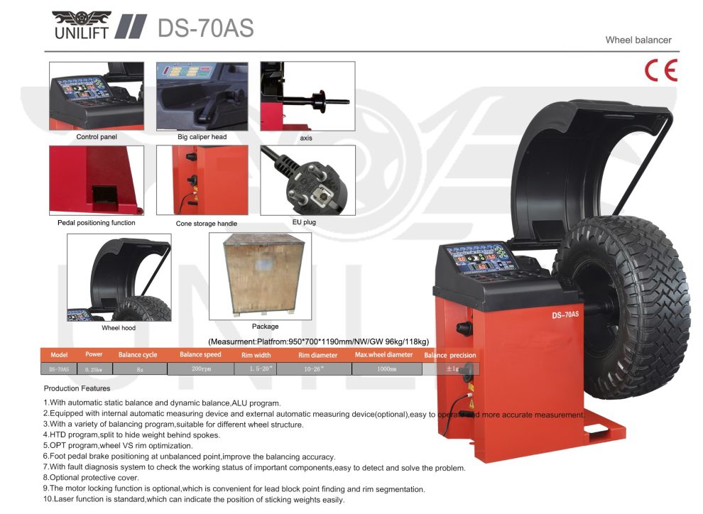 Oppnå nøyaktig og effektiv avbalansering med UNILIFT DS70AS, en prisgunstig løsning som kombinerer driftssikkerhet og høy kvalitet. Denne pålitelige maskinen håndterer dekk og hjul opptil 80 kg, med felgdiameter fra 10 til 24 tommer.